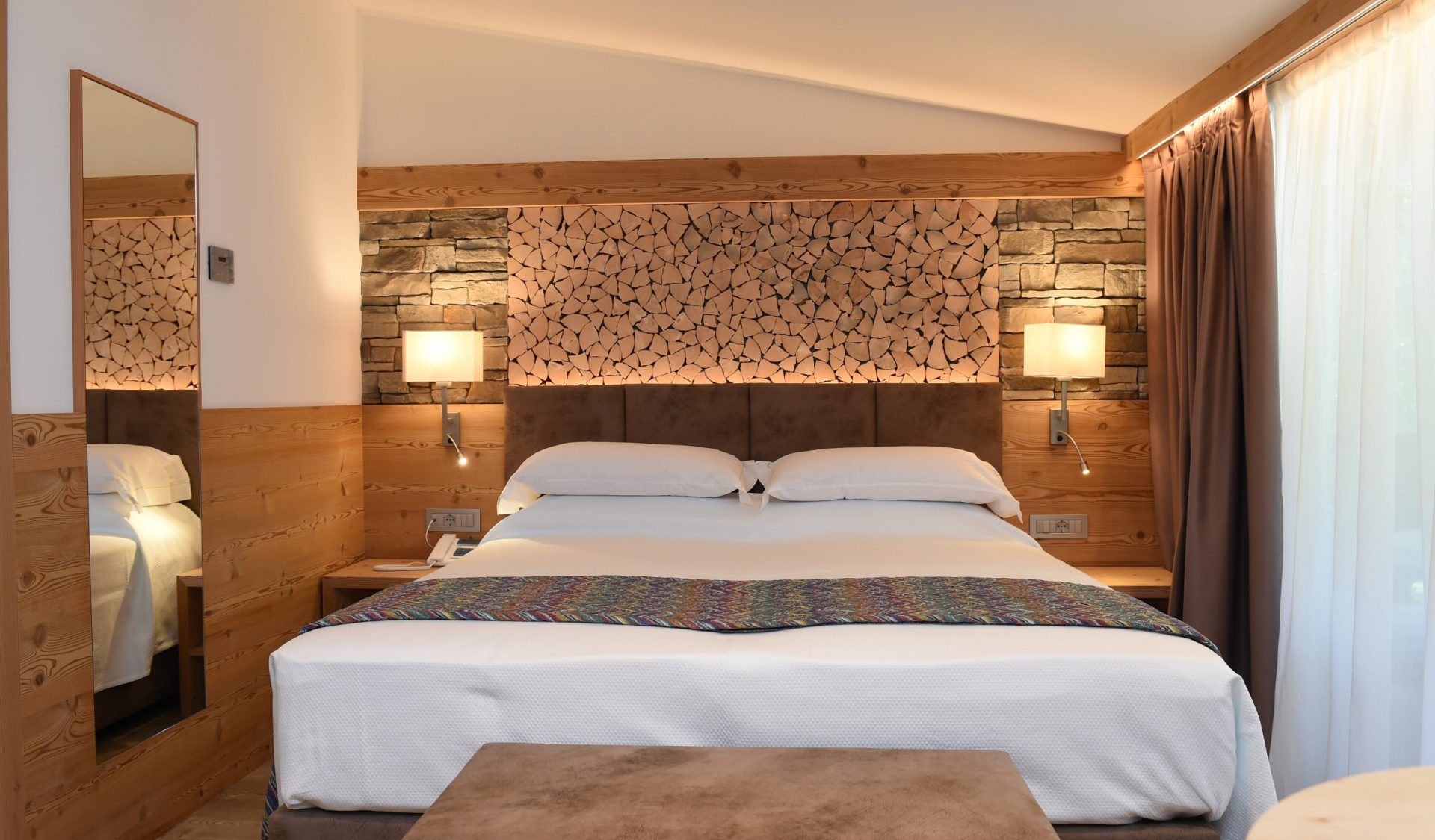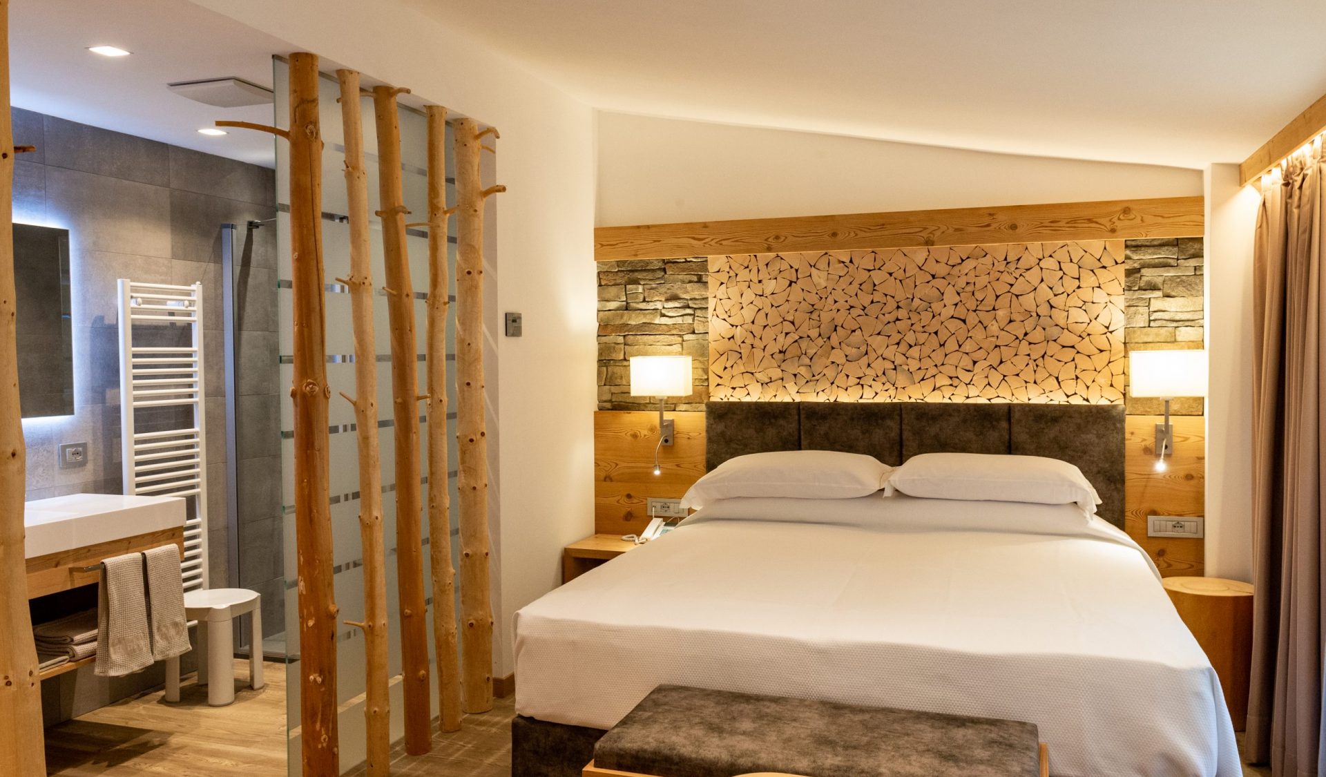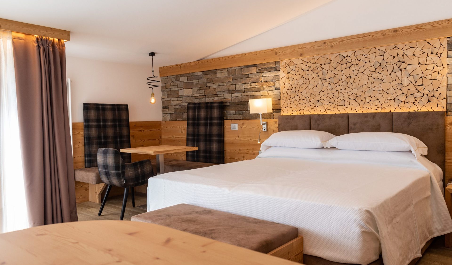 La Junior Suite Deluxe dispone di un terrazzo esposto a sud con vista su un parco verdeggiante. All’interno dei 39 mq ci sono la camera da letto, la zona soggiorno, il bagno con doccia o vasca. L’arredamento in larice e il pavimento in legno sono espressione del legame con il territorio montano.