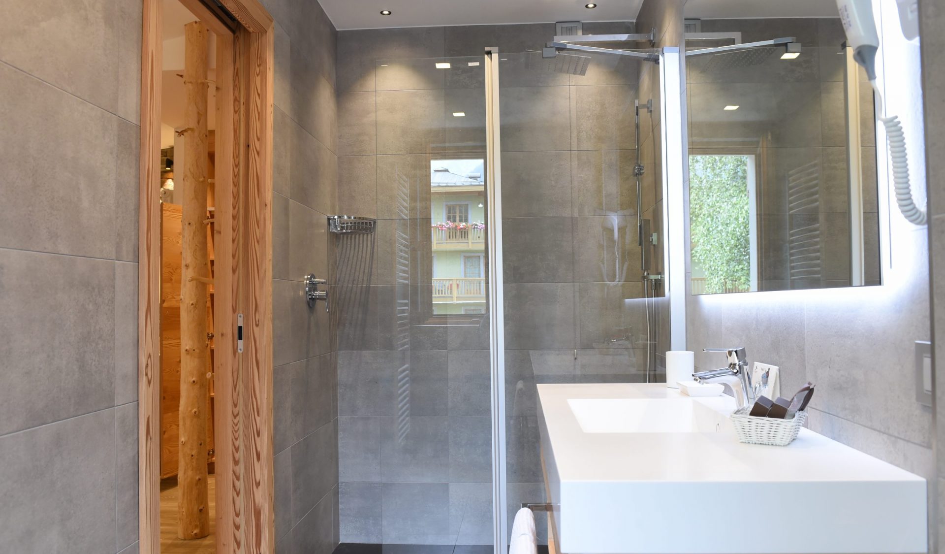 The Alpine Junior Suite measures 27 sq. meters and features an enchanting double bedroom with furnishings in larch and wooden floor, living area, bathroom with shower, telephone, Sky TV, safe, refrigerator. The balcony overlooks the mountains around.