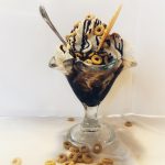 Gelato al biscotto, topping al cioccolato, cereali e panna montata